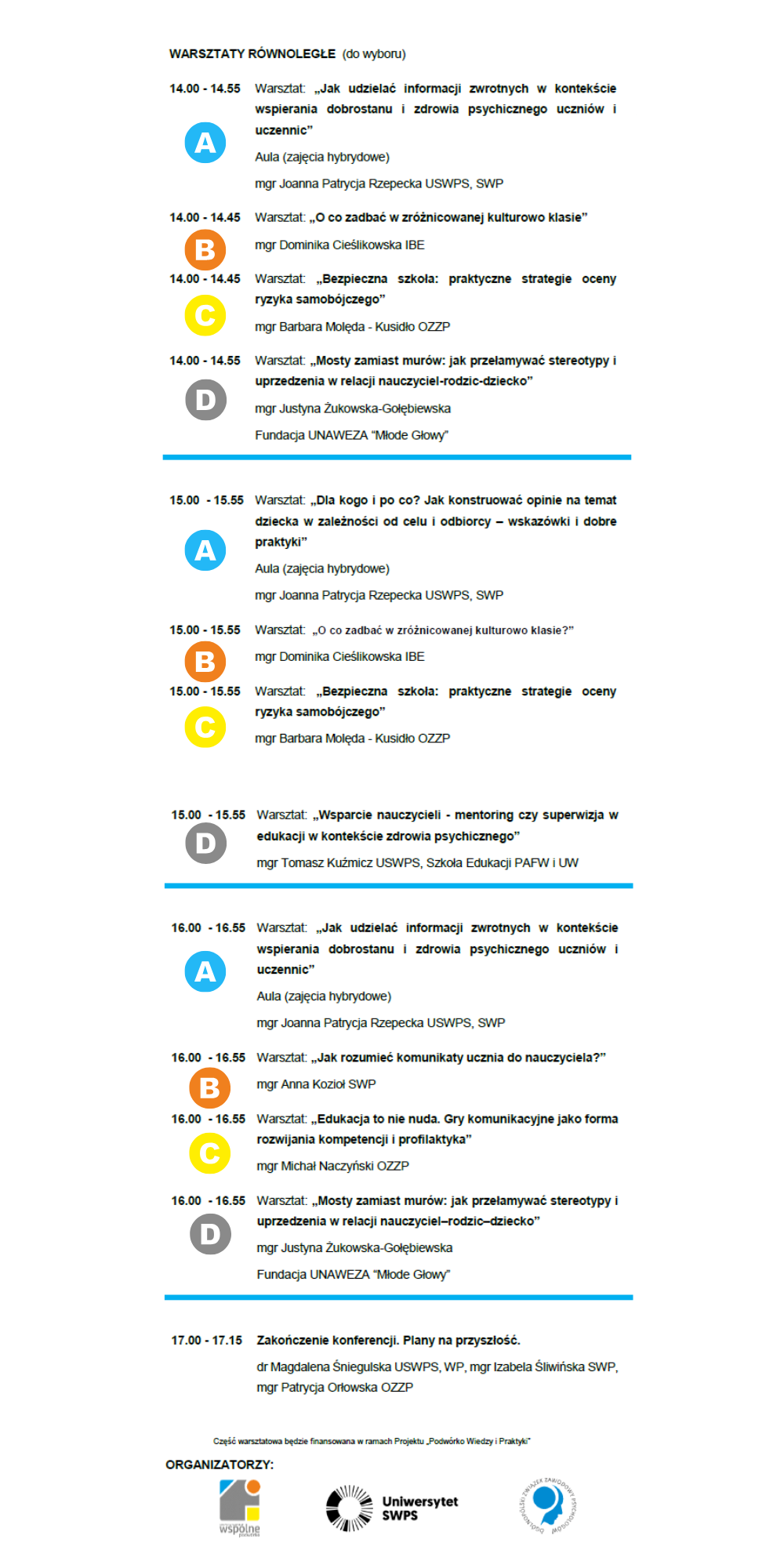 Szczegóły dotyczące realizacji warsztatów (miejsce, godzina, prowadzący) zawarte są w opisie danego wydarzenia.